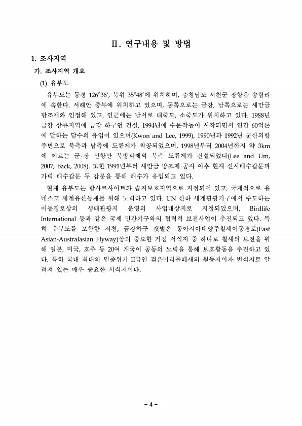 Ⅱ. 연구내용 및 방법 1. 조사지역 가. 조사지역 개요 1 유부도 유부도는 동경 126°36‘, 북위 35°48’에 위치하며, 충청남도 서천군 장항읍 송림리 에 속한다. 서해안 중부에 위치하고 있으며, 동쪽으로는 금강, 남쪽으로는 새만금 방조제와 인접해 있고, 인근에는 남서로 대죽도, 소죽도가 위치하고 있다. 1988년 금강 상류지역에 금강 하구언 건설, 1994년에 수문작동이 시작되면서 연간 60억톤 에 달하는 담수의 유입이 있으며 Kwon and Lee, 1999 , 1990년과 1992년 군산외항 주변으로 북측과 남측에 도류제가 착공되었으며, 1998년부터 2004년까지 약 3km 에 이르는 군 장 신항만 북방파제와 북측 도류제가 건설되었다 Lee and Um, 2007; Back, 2008 또한 1...