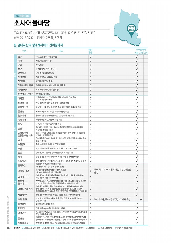 No. 부천- 본 생태자산의 생태계서비스 간이평가지 구분 예시 평가 등급 설명 규모별 혜택 지점 지역 국가 공급 담수 식수, 농업용수, 축산 용수 등 0 √ 식량 곡물, 과실, 물고기 등 0 √ 연료 화목, 토탄 0 √ 섬유 건축용 목재, 의류용 섬유 등 0 √ 유전자원 농업·축산업 희귀품종 등 0 √ 천연약재 전통 의약품에 사용되는 식물 0 √ 장식재료 수집용 조개껍질, 꽃 등 0 √ 진흙,미네랄, 골재 건축용 모래 또는 자갈, 벽돌재료 진흙 등 0 √ 폐기물처리 고체 쓰레기 하치, 폐수 방류 등 0 √ 친환경에너지발전 조력발전, 풍력발전 0 √ 조절 대기질 자동차 배기가스, 산업체 대기오염, 농업발생 먼지 등의 대기 미세물질의 제거 0 √ 지역적 기후 그늘, 대기온도 저하 등의 지역 미세기후 조절 0 √...