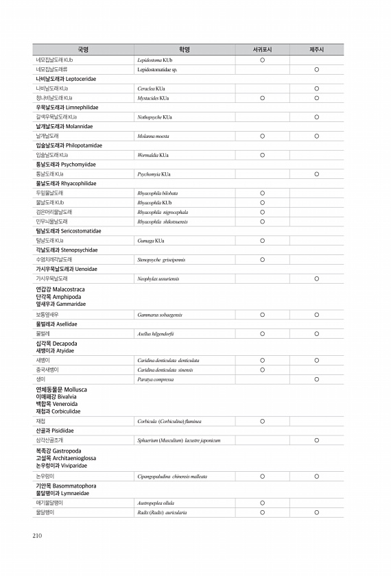 210 네모집날도래 KUb Lepidostoma KUb ○ 네모집날도래류 Lepidostomatidae sp. ○ 나비날도래과 Leptoceridae 나비날도래 KUa Ceraclea KUa ○ 청나비날도래 KUa Mystacides KUa ○ ○ 우묵날도래과 Limnephilidae 갈색우묵날도래 KUa Nothopsyche KUa ○ 날개날도래과 Molannidae 날개날도래 Molanna moesta ○ ○ 입술날도래과 Philopotamidae 입술날도래 KUa Wormaldia KUa ○ 통날도래과 Psychomyiidae 통날도래 KUa Psychomyia KUa ○ 물날도래과 Rhyacophilidae 두잎물날도래 Rhyacophila bilobata ○ 물날도래 KUb Rhyacophila K...
