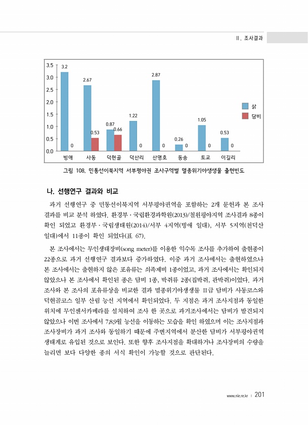 Ⅱ. 조사결과 www.nie.re.kr ? 201 0.0 0.5 1.0 1.5 2.0 2.5 3.0 3.5 빙애 사동 덕현골 덕산리 산명호 동송 토교 이길리 0 0.53 0.66 0 0 0 0 0 3.2 2.67 0.87 1.22 2.87 0.26 1.05 0.53 삵 담비 그림 108. 민통선이북지역 서부평야권 조사구역별 멸종위기야생생물 출현빈도 나. 선행연구 결과와 비교 과거 선행연구 중 민통선이북지역 서부평야권역을 포함하는 2개 문헌과 본 조사 결과를 비교 분석 하였다. 환경부·국립환경과학원 2013 /철원평야지역 조사결과 8종이 확인 되었고 환경부·국립생태원 2014 /서부 4지역 빙애 일대 , 서부 5지역 천덕산 일대 에서 11종이 확인 되었다 표 67 본 조사에서는 무인생태장비 song meter...