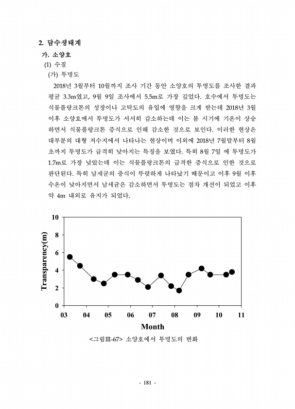 181 2. 담수생태계 가. 소양호 1 수질 가 투명도 2018년 3월부터 10월까지 조사 기간 동안 소양호의 투명도를 조사한 결과 평균 3.3m였고, 9월 9일 조사에서 5.5m로 가장 깊었다. 호수에서 투명도는 식물플랑크톤의 성장이나 고탁도의 유입에 영향을 크게 받는데 2018년 3월 이후 소양호에서 투명도가 서서히 감소하는데 이는 봄 시기에 기온이 상승 하면서 식물플랑크톤 증식으로 인해 감소한 것으로 보인다. 이러한 현상은 대부분의 대형 저수지에서 나타나는 현상이며 이외에 2018년 7월말부터 8월 초까지 투명도가 급격히 낮아지는 특징을 보였다. 특히 8월 7일 에 투명도가 1.7m로 가장 낮았는데 이는 식물플랑크톤의 급격한 증식으로 인한 것으로 판단된다. 특히 남세균의 증식이 뚜렷하게 나타났기 때문이...