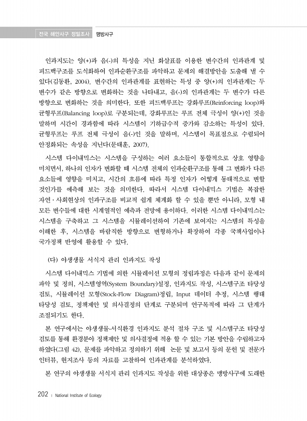 전국 해안사구 정밀조사 맹방사구 202 ? National Institute of Ecology 인과지도는 양 + 과 음 의 특성을 지닌 화살표를 이용한 변수간의 인과관계 및 피드백구조를 도식화하여 인과순환구조를 파악하고 문제의 해결방안을 도출해 낼 수 있다 김동환, 2004 변수간의 인과관계를 표현하는 특성 중 양 + 의 인과관계는 두 변수가 같은 방향으로 변화하는 것을 나타내고, 음 의 인과관계는 두 변수가 다른 방향으로 변화하는 것을 의미한다. 또한 피드백루프는 강화루프 Reinforcing loop 와 균형루프 Balancing loop 로 구분되는데, 강화루프는 루프 전체 극성이 양 + 인 것을 말하며 시간이 경과함에 따라 시스템이 기하급수적 증가와 감소하는 특성이 있다. 균형루프는 루프 전체 극성...