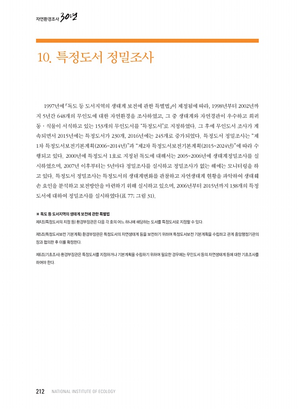 1997년에 「독도 등 도서지역의 생태계 보전에 관한 특별법」이 제정됨에 따라, 1998년부터 2002년까 지 5년간 648개의 무인도에 대한 자연환경을 조사하였고, 그 중 생태계와 자연경관이 우수하고 희귀 동 · 식물이 서식하고 있는 153개의 무인도서를 “특정도서”로 지정하였다. 그 후에 무인도서 조사가 계 속되면서 2015년에는 특정도서가 230개, 2016년에는 245개로 증가되었다. 특정도서 정밀조사는 “제 1차 특정도서보전기본계획 20062014년 ”과 “제2차 특정도서보전기본계획 20152024년 ”에 따라 수 행되고 있다. 2000년에 특정도서 1호로 지정된 독도에 대해서는 20052006년에 생태계정밀조사를 실 시하였으며, 2007년 이후부터는 5년마다 정밀조사를 실시하고 정밀조사가 없는 해...