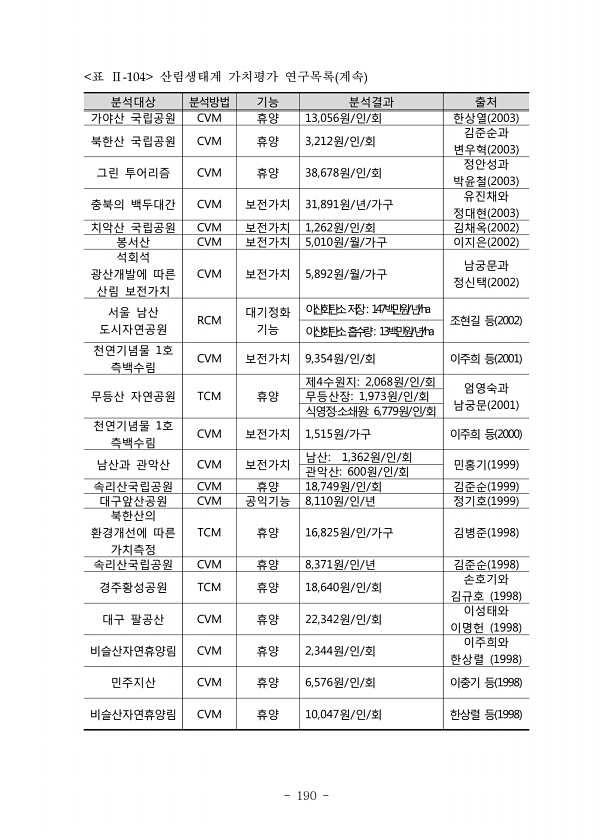190 분석대상 분석방법 기능 분석결과 출처 가야산 국립공원 CVM 휴양 13,056원/인/회 한상열 2003 북한산 국립공원 CVM 휴양 3,212원/인/회 김준순과 변우혁 2003 그린 투어리즘 CVM 휴양 38,678원/인/회 정안성과 박윤철 2003 충북의 백두대간 CVM 보전가치 31,891원/년/가구 유진채와 정대현 2003 치악산 국립공원 CVM 보전가치 1,262원/인/회 김채옥 2002 봉서산 CVM 보전가치 5,010원/월/가구 이지은 2002 석회석 광산개발에 따른 산림 보전가치 CVM 보전가치 5,892원/월/가구 남궁문과 정신택 2002 서울 남산 도시자연공원 RCM 대기정화 기능 이산화탄소저장147백만원/년/ha 조현길 등 2002 이산화탄소흡수량13백만원/년/ha 천연기념물 1호 ...
