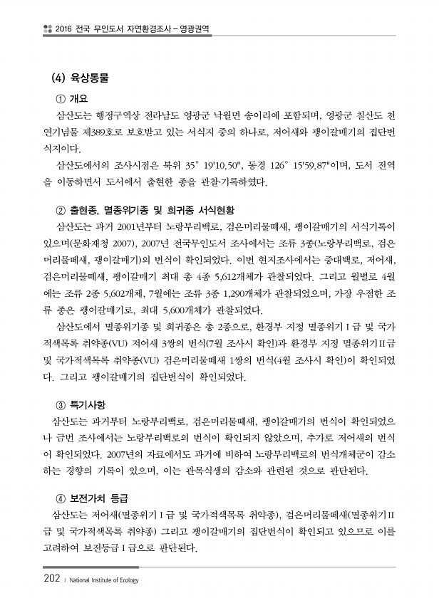 2016 전국 무인도서 자연환경조사 영광권역 202 ? National Institute of Ecology 4 육상동물 ① 개요 삼산도는 행정구역상 전라남도 영광군 낙월면 송이리에 포함되며, 영광군 칠산도 천 연기념물 제389호로 보호받고 있는 서식지 중의 하나로, 저어새와 괭이갈매기의 집단번 식지이다. 삼산도에서의 조사시점은 북위 35°1910.50, 동경 126°1559.87이며, 도서 전역 을 이동하면서 도서에서 출현한 종을 관찰?기록하였다. ② 출현종, 멸종위기종 및 희귀종 서식현황 삼산도는 과거 2001년부터 노랑부리백로, 검은머리물떼새, 괭이갈매기의 서식기록이 있으며 문화재청 2007 , 2007년 전국무인도서 조사에서는 조류 3종 노랑부리백로, 검은 머리물떼새, 괭이갈매기 의 번식이 확인되었다...