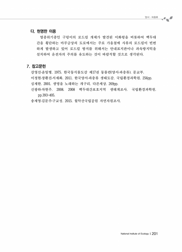 양서ㆍ파충류 National Institute of EcologyⅠ201 다. 현명한 이용 멸종위기종인 구렁이의 로드킬 개체가 발견된 이화령을 비롯하여 백두대 간을 횡단하는 마루금상의 도로에서는 주로 가을철에 사류의 로드킬이 빈번 하게 발생하고 있어 로드킬 방지를 위해서는 안내표지판이나 과속방지턱을 설치하여 운전자의 주의를 유도하는 것이 바람직할 것으로 생각된다. 7. 참고문헌 강영선?윤일병. 1975. 한국동식물도감 제17권 동물편 양서?파충류 문교부. 이정현?장환진?서재화. 2011. 한국양서?파충류 생태도감. 국립환경과학원. 256pp. 심재한. 2001. 생명을 노래하는 개구리. 다른세상. 269pp. 신광하?차현주. 2008. 2008 백두대간보호지역 생태계조사. 국립환경과학원. pp.393405....