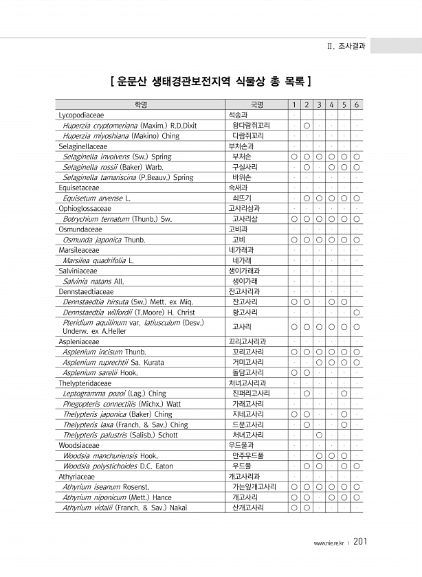 Ⅱ. 조사결과 www.nie.re.kr ? 201 학명 국명 1 2 3 4 5 6 Lycopodiaceae 석송과 Huperzia cryptomeriana Maxim. R.D.Dixit 왕다람쥐꼬리 ○ Huperzia miyoshiana Makino Ching 다람쥐꼬리 Selaginellaceae 부처손과 Selaginella involvens Sw. Spring 부처손 ○ ○ ○ ○ ○ ○ Selaginella rossii Baker Warb. 구실사리 ○ ○ ○ ○ Selaginella tamariscina P.Beauv. Spring 바위손 Equisetaceae 속새과 ...
