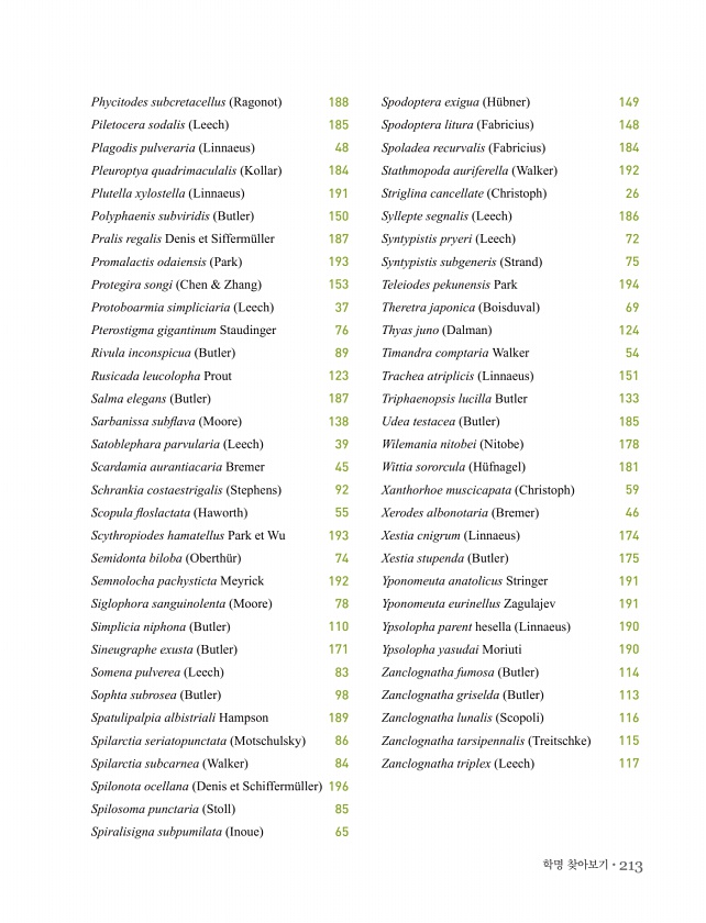 학명 찾아보기?213 Phycitodes subcretacellus Ragonot 188 Piletocera sodalis Leech 185 Plagodis pulveraria Linnaeus 48 Pleuroptya quadrimaculalis Kollar 184 Plutella xylostella Linnaeus 191 Polyphaenis subviridis Butler 150 Pralis regalis Denis et Sifferm?ller 187 Promalactis odaiensis Park 193 Protegira songi Chen & Zhang 153 Protoboarmia simpliciaria Leech 37 Pterostigma gigantinum Staudinger 76 Rivula ...