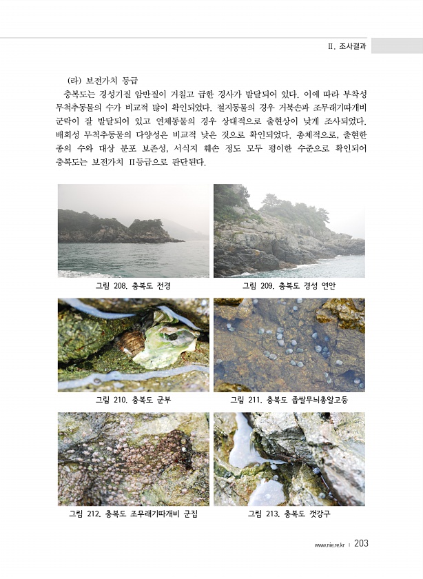 Ⅱ. 조사결과 www.nie.re.kr ? 203 라 보전가치 등급 충복도는 경성기질 암반질이 거칠고 급한 경사가 발달되어 있다. 이에 따라 부착성 무척추동물의 수가 비교적 많이 확인되었다. 절지동물의 경우 거북손과 조무래기따개비 군락이 잘 발달되어 있고 연체동물의 경우 상대적으로 출현상이 낮게 조사되었다. 배회성 무척추동물의 다양성은 비교적 낮은 것으로 확인되었다. 총체적으로, 출현한 종의 수와 대상 분포 보존성, 서식지 훼손 정도 모두 평이한 수준으로 확인되어 충복도는 보전가치 Ⅱ등급으로 판단된다. 그림 208. 충복도 전경 그림 209. 충복도 경성 연안 그림 210. 충복도 군부 그림 211. 충복도 좁쌀무늬총알고둥 그림 212. 충복도 조무래기따개비 군집 그림 213. 충복도갯강구