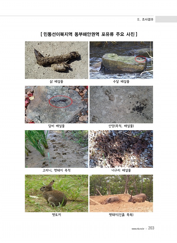 Ⅱ. 조사결과 www.nie.re.kr ? 203 [ 민통선이북지역 동부해안권역 포유류 주요 사진 ] 삵 배설물 수달 배설물 담비 배설물 산양 족적, 배설물 고라니, 멧돼지 족적 너구리 배설물 멧토끼 멧돼지 진흙 목욕