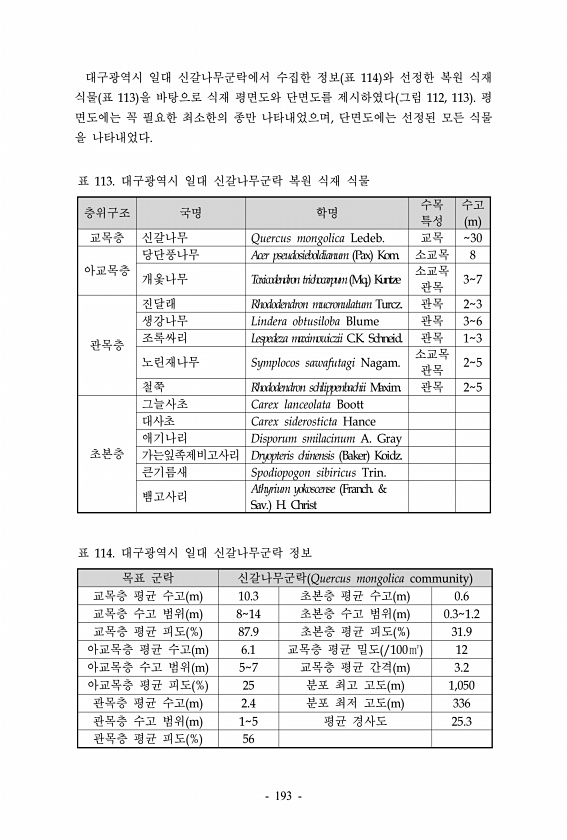 대구광역시 일대 신갈나무군락에서 수집한 정보 표 114 와 선정한 복원 식재 식물 표 113 을 바탕으로 식재 평면도와 단면도를 제시하였다 그림 112, 113 평 면도에는 꼭 필요한 최소한의 종만 나타내었으며, 단면도에는 선정된 모든 식물 을 나타내었다. 층위구조 국명 학명 수목 특성 수고 m 교목층 신갈나무 Quercus mongolica Ledeb. 교목 30 아교목층 당단풍나무 Acer pseudosieboldianum Pax Kom. 소교목 8 개옻나무 Toxicodendron trichocarpum Miq. Kuntze 소교목 관목 37 관목층 진달래 Rhododendron mucronulatum Turcz. 관목 23 생강나무 Lindera obtusiloba Blume 관목 36 조록싸리 Le...