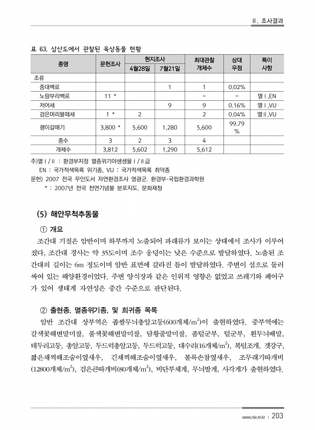 Ⅱ. 조사결과 www.nie.re.kr ? 203 표 63. 삼산도에서 관찰된 육상동물 현황 종명 문헌조사 현지조사 최대관찰 개체수 상대 우점 특이 4월28일 7월21일 사항 조류 중대백로 1 1 0.02% 노랑부리백로 11 * 멸Ⅰ,EN 저어새 9 9 0.16% 멸Ⅰ,VU 검은머리물떼새 1 * 2 2 0.04% 멸Ⅱ,VU 괭이갈매기 3,800 * 5,600 1,280 5,600 99.79 % 종수 3 2 3 4 개체수 3,812 5,602 1,290 5,612 주 멸Ⅰ/Ⅱ 환경부지정 멸종위기야생생물Ⅰ/Ⅱ급 EN 국가적색목록 위기종, VU 국가적색목록 취약종 문헌 2007 전국 무인도서 자연환경조사 영광군. 환경부·국립환경과학원 * 2007년 전국 천연기념물 분포지도. 문화재청 ...