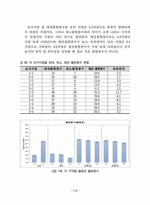 조사지점 중 최대출현종수를 보인 지점은 1-3지점으로 본류인 방태천에 서 하류인 지점이다. 그러나 최소출현종수와의 차이가 크게 나타나 서식차 가 안정적인 지점은 아닌 것으로 판단된다. 평균출현종수로는 1-3지점이 가장 높게 나타났으며, 평균출현종수가 높고, 표준편차도 낮은 지점은 3-1 지점으로 나타났다. 3-2지점은 평균출현종수가 가장 낮게 나타났으나 산지 습지의 면적 및 특이성을 감안할 때 결코 적은 출현종수가 아니다. 조사지점 최대출현종수 최소출현종수 평균 출현종수 표준편차 1-1 13 7 10.0 2.2 3-1 30 26 28.5 1.7 1-2 17 8 11.8 3.3 2-2 17 6 11.0 4.3 3-2 8 4 6.3 1.5 1-3 48 18 31.3 11.7 2-3 38 23 29.8 6.1 3...