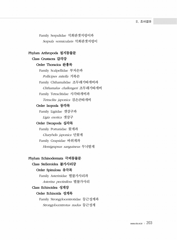 Ⅱ. 조사결과 www.nie.re.kr ? 203 Family Serpulidae 석회관갯지렁이과 Serpula vermicularis 석회관갯지렁이 Phylum Arthropoda 절지동물문 Class Crustacea 갑각강 Order Thoracica 완흉목 Family Scalpellidae 부처손과 Pollicipes mitella 거북손 Family Chthamalidae 조무래기따개비과 Chthamalus challengeri 조무래기따개비 Family Tetraclitidae 사각따개비과 Tetraclita japonica 검은큰따개비 Order Isopoda 등각목 Family Ligiidae 갯강구과 Ligia exotica 갯강구 Order Decapoda 십각목 Family Portun...