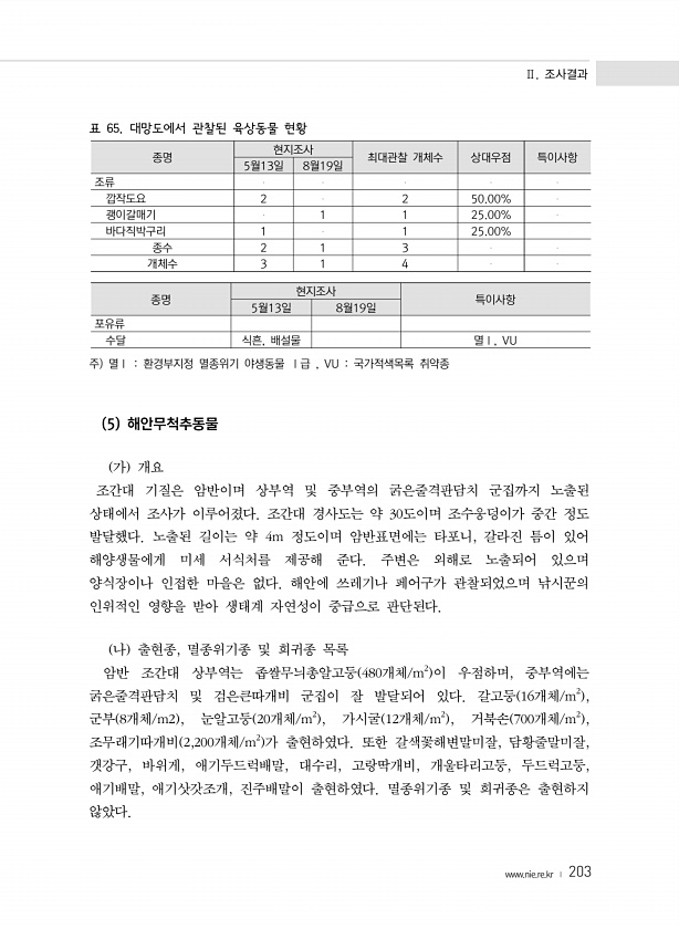 Ⅱ. 조사결과 www.nie.re.kr ? 203 표 65. 대망도에서 관찰된 육상동물 현황 종명 현지조사 최대관찰 개체수 상대우점 특이사항 5월13일 8월19일 조류 깝작도요 2 2 50.00% 괭이갈매기 1 1 25.00% 바다직박구리 1 1 25.00% 종수 2 1 3 개체수 3 1 4 종명 현지조사 특이사항 5월13일 8월19일 포유류 수달 식흔, 배설물 멸Ⅰ, VU 주 멸Ⅰ 환경부지정 멸종위기 야생동물 Ⅰ급 , VU 국가적색목록 취약종 5 해안무척추동물 가 개요 조간대 기질은 암반이며 상부역 및 중부역의 굵은줄격판담치 군집까지 노출된 상태에서 조사가 이루어졌다. 조간대 경사도는 약 30도이며 조수웅덩이가 중간 정도 발달했다. 노출된 길이는 약 4m ...