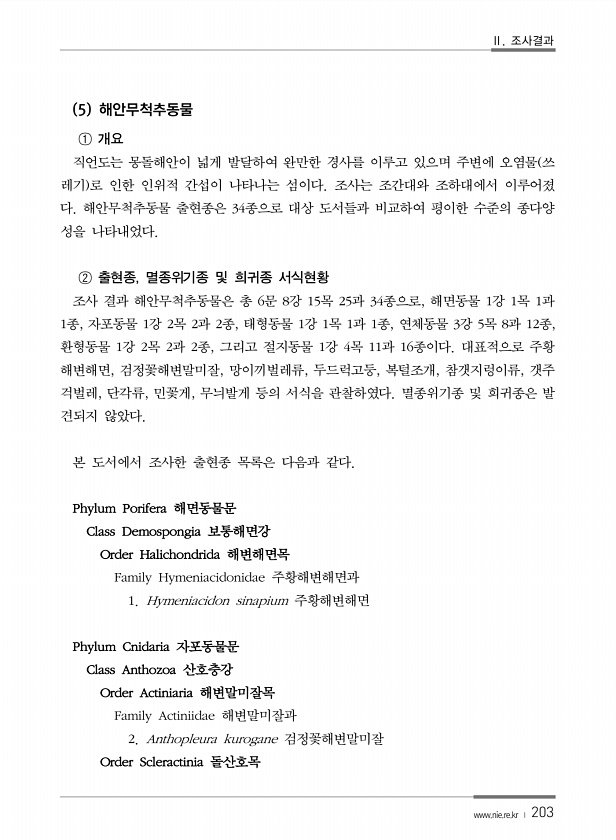 Ⅱ. 조사결과 www.nie.re.kr ? 203 5 해안무척추동물 ① 개요 직언도는 몽돌해안이 넓게 발달하여 완만한 경사를 이루고 있으며 주변에 오염물 쓰 레기 로 인한 인위적 간섭이 나타나는 섬이다. 조사는 조간대와 조하대에서 이루어졌 다. 해안무척추동물 출현종은 34종으로 대상 도서들과 비교하여 평이한 수준의 종다양 성을 나타내었다. ② 출현종, 멸종위기종 및 희귀종 서식현황 조사 결과 해안무척추동물은 총 6문 8강 15목 25과 34종으로, 해면동물 1강 1목 1과 1종, 자포동물 1강 2목 2과 2종, 태형동물 1강 1목 1과 1종, 연체동물 3강 5목 8과 12종, 환형동물 1강 2목 2과 2종, 그리고 절지동물 1강 4목 11과 16종이다. 대표적으로 주황 해변해면, 검정꽃해변말미잘, 망이끼벌레...
