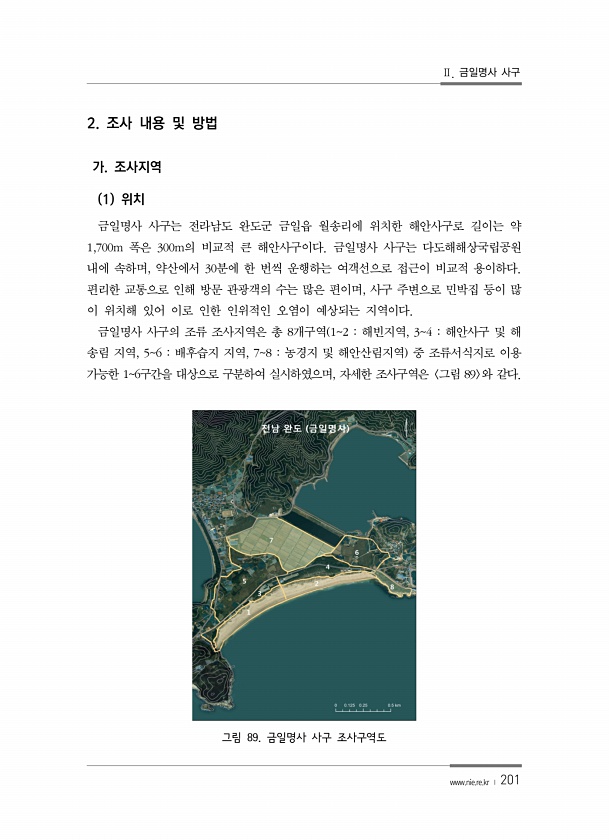 Ⅱ. 금일명사 사구 www.nie.re.kr ? 201 2. 조사 내용 및 방법 가. 조사지역 1 위치 금일명사 사구는 전라남도 완도군 금일읍 월송리에 위치한 해안사구로 길이는 약 1,700m 폭은 300m의 비교적 큰 해안사구이다. 금일명사 사구는 다도해해상국립공원 내에 속하며, 약산에서 30분에 한 번씩 운행하는 여객선으로 접근이 비교적 용이하다. 편리한 교통으로 인해 방문 관광객의 수는 많은 편이며, 사구 주변으로 민박집 등이 많 이 위치해 있어 이로 인한 인위적인 오염이 예상되는 지역이다. 금일명사 사구의 조류 조사지역은 총 8개구역 12 해빈지역, 34 해안사구 및 해 송림 지역, 56 배후습지 지역, 78 농경지 및 해안산림지역 중 조류서식지로 이용 가능한 16구간을 대상으로 구분하여 실시하였으며...