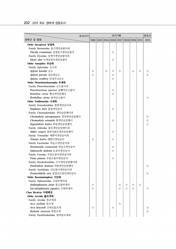 202 2015 독도 생태계 정밀조사 조사시기 분류군 및 종명 과거기록 본조사 1999 2003 2004 2006 2007 2008 2009 2010 2015 Order Sacoglossa 낭설목 Family Hermaeidae 돌기갯민숭붙이과 Placida cremoniana 검정돌기갯민숭붙이 ○ Family Elysiidae 날씬이갯민숭붙이과 Elysia abei 녹색날씬이갯민숭붙이 ○ Order Anaspidea 무순목 Family Aplysiidae 군소과 Aplysia kurodai 군소 ○ ○ ○ ○ ○ ○ ○ Aplysia parvula 검은테군소 ○ ○ ○ Aplysia oculifera 안경무늬군소 ○ Order Pleurobranchomorpha 우새목 Family Pleurobranchi...