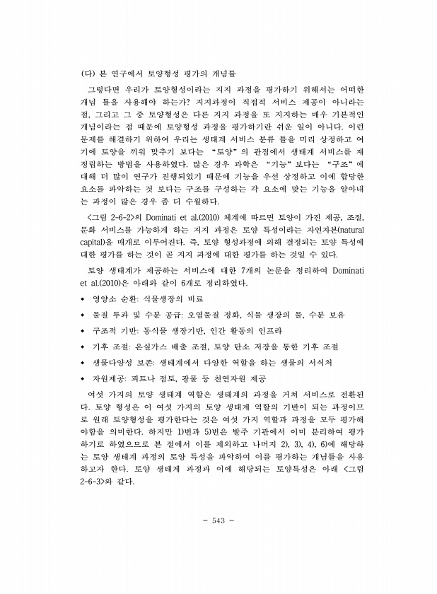543 다 본 연구에서 토양형성 평가의 개념틀 그렇다면 우리가 토양형성이라는 지지 과정을 평가하기 위해서는 어떠한 개념 틀을 사용해야 하는가? 지지과정이 직접적 서비스 제공이 아니라는 점, 그리고 그 중 토양형성은 다른 지지 과정을 또 지지하는 매우 기본적인 개념이라는 점 때문에 토양형성 과정을 평가하기란 쉬운 일이 아니다. 이런 문제를 해결하기 위하여 우리는 생태계 서비스 분류 틀을 미리 상정하고 여 기에 토양을 끼워 맞추기 보다는 “토양”의 관점에서 생태계 서비스를 재 정립하는 방법을 사용하였다. 많은 경우 과학은 “기능”보다는 “구조”에 대해 더 많이 연구가 진행되었기 때문에 기능을 우선 상정하고 이에 합당한 요소를 파악하는 것 보다는 구조를 구성하는 각 요소에 맞는 기능을 알아내 는 과정이 많은 경우...