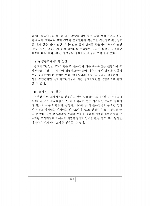 188 과 대표지점에서의 확산과 축소 경향을 파악 할수 있다. 또한 드론을 이용 한 조사를 강화하여 보다 정밀한 분포현황과 식생도를 작성하고 확산정도 를 평가 할수 있다. 또한 데이터로고 등의 장비를 활용하여 환경적 요인 온도, 습도, 광조건 에 대한 데이터를 수집하여 서식지 특성을 분석하고 환경에 따라 개화, 결실, 생장등의 생물학적 특성을 분석 할수 있다. 가 공동조사지역의 선정 생태계교란생물 모니터링은 각 분류군이 다른 조사지점을 선정하여 조 사연구를 진행하기 때문에 생태계교란생물에 의한 생태계 영향을 종합적 으로 분석하기에는 한계가 있다. 일정범위의 공동조사구역을 설정하여 조 사를 수행한다면, 생태계교란생물에 의한 생태계교란을 종합적으로 판단 할 수 있다. 3 조사시기 및 횟수 적정한 수의 조사지점을...