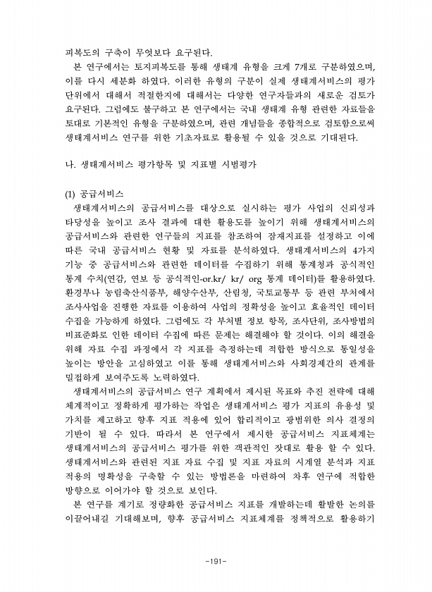 -191- 피복도의 구축이 무엇보다 요구된다 본 연구에서는 토지피복도를 통해 생태계 유형을 크게 개로 구분하였으며 이를 다시 세분화 하였다 이러한 유형의 구분이 실제 생태계서비스의 평가 단위에서 대해서 적절한지에 대해서는 다양한 연구자들과의 새로운 검토가 요구된다 그럼에도 불구하고 본 연구에서는 국내 생태계 유형 관련한 자료들을 토대로 기본적인 유형을 구분하였으며 관련 개념들을 종합적으로 검토함으로써 생태계서비스 연구를 위한 기초자료로 활용될 수 있을 것으로 기대된다 나 생태계서비스 평가항목 및 지표별 시범평가 공급서비스 생태계서비스의 공급서비스를 대상으로 실시하는 평가 사업의 신뢰성과 타당성을 높이고 조사 결과에 대한 활용도를 높이기 위해 생태계서비스의 공급서비스와 관련한 연구들의 지표를 참조하여 잠재지표...