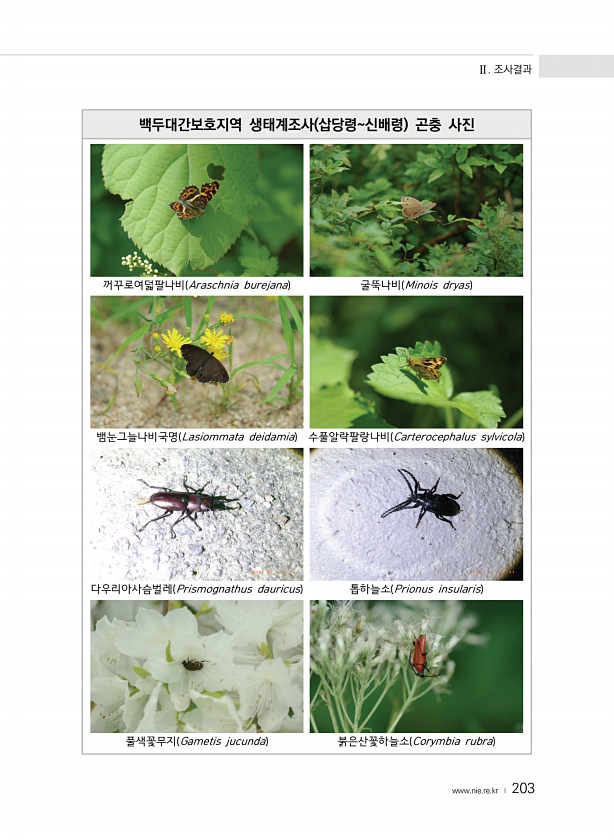 Ⅱ. 조사결과 www.nie.re.kr ? 203 백두대간보호지역 생태계조사 삽당령신배령 곤충 사진 꺼꾸로여덟팔나비 Araschnia burejana 굴뚝나비 Minois dryas 뱀눈그늘나비국명 Lasiommata deidamia 수풀알락팔랑나비 Carterocephalus sylvicola 다우리아사슴벌레 Prismognathus dauricus 톱하늘소 Prionus insularis 풀색꽃무지 Gametis jucunda 붉은산꽃하늘소 Corymbia rubra