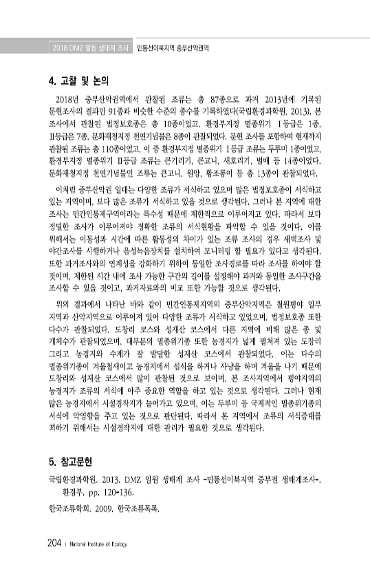 2018 DMZ 일원 생태계 조사 민통선이북지역 중부산악권역 204 ? National Institute of Ecology 4. 고찰 및 논의 2018년 중부산악권역에서 관찰된 조류는 총 87종으로 과거 2013년에 기록된 문헌조사의 결과인 91종과 비슷한 수준의 종수를 기록하였다 국립환경과학원, 2013 본 조사에서 관찰된 법정보호종은 총 10종이었고, 환경부지정 멸종위기 Ⅰ등급은 1종, Ⅱ등급은 7종, 문화재청지정 천연기념물은 8종이 관찰되었다. 문헌 조사를 포함하여 현재까지 관찰된 조류는 총 110종이었고, 이 중 환경부지정 멸종위기 Ⅰ등급 조류는 두루미 1종이었고, 환경부지정 멸종위기 Ⅱ등급 조류는 큰기러기, 큰고니, 새호리기, 벌매 등 14종이었다. 문화재청지정 천연기념물인 조류는 큰고니, 원앙,...