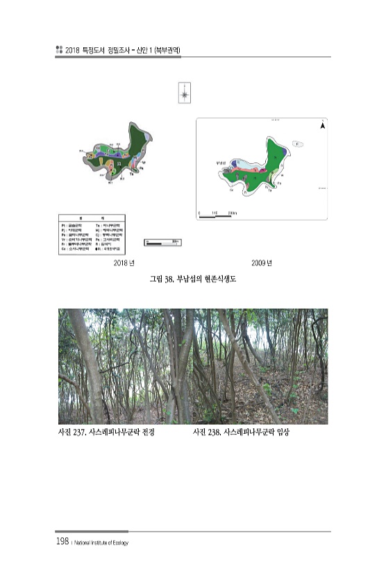 2018 특정도서 정밀조사 신안 1 북부권역 198 ? National Institute of Ecology 2018 년 2009 년 그림 38. 부남섬의 현존식생도 사진 237. 사스레피나무군락 전경 사진 238. 사스레피나무군락임상