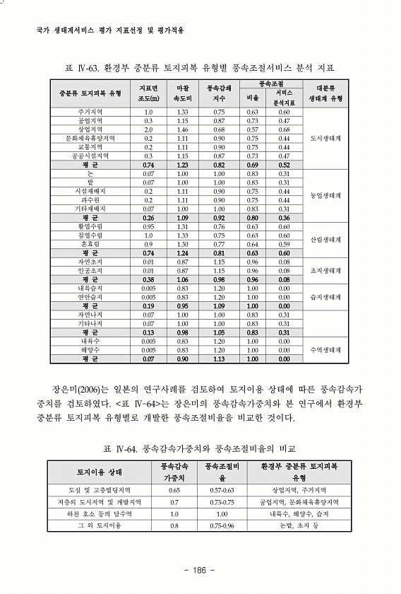 국가 생태계서비스 평가 지표선정 및 평가적용 186 중분류 토지피복 유형 지표면 조도 m 마찰 속도비 풍속감쇄 지수 풍속조절 대분류 비율 서비스 생태계 유형 분석지표 주거지역 1.0 1.33 0.75 0.63 0.60 도시생태계 공업지역 0.3 1.15 0.87 0.73 0.47 상업지역 2.0 1.46 0.68 0.57 0.68 문화체육휴양지역 0.2 1.11 0.90 0.75 0.44 교통지역 0.2 1.11 0.90 0.75 0.44 공공시설지역 0.3 1.15 0.87 0.73 0.47 평 균 0.74 1.23 0.82 0.69 0.52 논 0.07 1.00 1.00 0.83 0.31 농업생태계 밭 0.07 1.00 1.00 0.83 0.31 시설재배지 0.2 1.11 0.90 0.75 0.44 과수...
