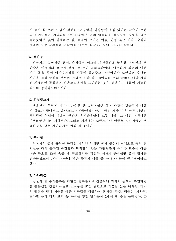 202 이 높아 톡 쏘는 느낌이 강하다 피부병과 위장병에 효험 있다는 약수터 주변 의 산천수목은 기암괴석으로 이루어져 마치 아름다운 산수화로 병풍을 펼쳐 놓은듯하며 꽃이 만개하는 봄 녹음이 우거진 여름 단풍 붉은 가을 순백의 겨울이 모두 금강산과 견줄만한 명소로 화암 경 중에 제 경에 속한다 옥산장 관광지의 일반적인 음식 숙박업과 비교해 자연환경을 활용한 여량면의 옥 산장은 여행객의 욕구에 맞게 잘 꾸민 문화공간이다 아우라지 강변의 여러 가지 돌을 주워 이야깃거리를 만들어 들려주고 정선아리랑 노랫말의 수많은 사연을 직접 노래를 부르며 전하고 또한 약 여종의 우리 들꽃을 마당 가득 히 재배하여 독창적인 산촌토속음식을 조리하는 것은 정선이기 때문에 가능한 최고의 생태적서비스이다 화절령고개 백운산과 두위봉 사이의...