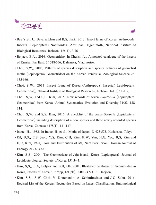 214 ?Bae Y.S., U. Bayarsaikhan and B.S. Park, 2013. Insect fauna of Korea. ArthropodaInsectaLepidopteraNoctuoideaArctiidae, Tiger moth. National Institute of Biological Resources, Incheon, 16 11 3-76. ?Beljaev, E.A., 2016. Geometridae. In Cherish A., Annotated catalogue of the insects of Russian Far East. 2518-666. Dalnauka, Vladivostok. ?Choi, S.W., 2006. Patterns of species description and speci...