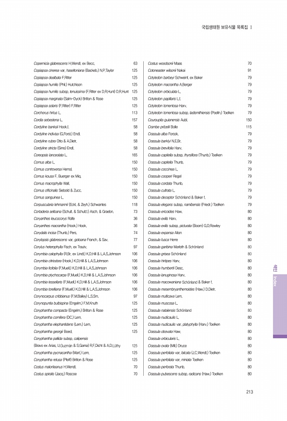 213 색인 Index 국립생태원 보유식물 목록집 Ⅰ Copernicia glabrescens H.Wendl. ex Becc. 63 Copiapoa cinerea var. haseltoniana Backeb. N.P.Taylor 125 Copiapoa dealbata F.Ritter 125 Copiapoa humilis Phil. Hutchison 125 Copiapoa humilis subsp. tenuissima F.Ritter ex D.R.Hunt D.R.Hunt 125 Copiapoa marginata Salm-Dyck Britton & Rose 125 Copiapoa solaris F.Ritter F.Ritter 125 Corchorus hirtus L. 113 Cordia sebestena L. ...