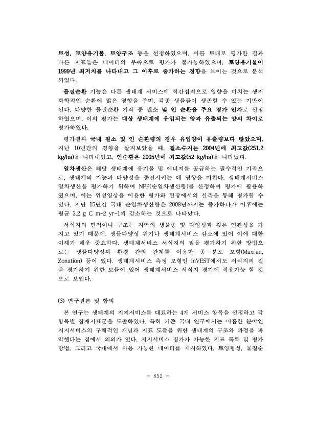 852 토성, 토양유기물, 토양구조 등을 선정하였으며, 이를 토대로 평가한 결과 다른 지표들은 데이터의 부족으로 평가가 불가능하였으며, 토양유기물이 1999년 최저치를 나타내고 그 이후로 증가하는 경향을 보이는 것으로 분석 되었다. 물질순환 기능은 다른 생태계 서비스에 직간접적으로 영향을 미치는 생지 화학적인 순환에 많은 영향을 주며, 각종 생물들이 생존할 수 있는 기반이 된다. 다양한 물질순환 기작 중 질소 및 인 순환을 주요 평가 인자로 선정 하였으며, 이의 평가는 대상 생태계에 유입되는 양과 유출되는 양의 차이로 평가하였다. 평가결과 국내 질소 및 인 순환량의 경우 유입양이 유출량보다 많았으며, 지난 10년간의 경향을 살펴보았을 때, 질소수지는 2004년에 최고값 251.2 kg/ha 을 나타내었고, ...