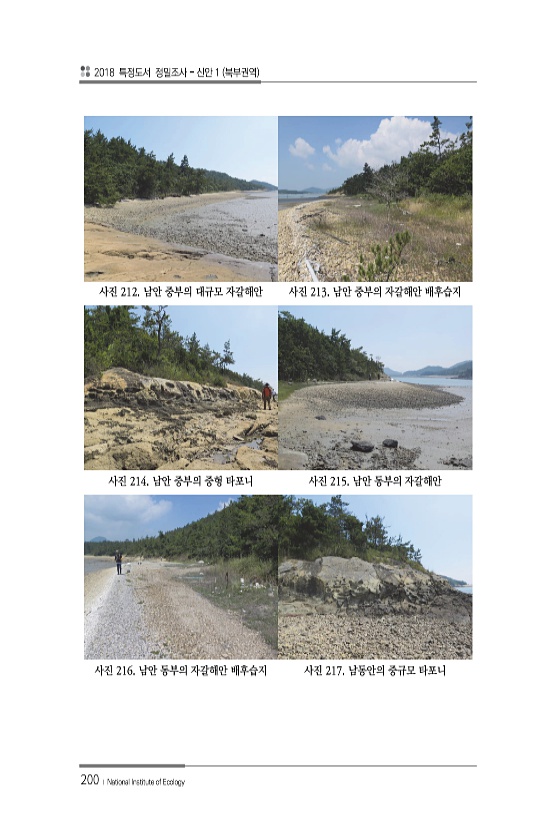 2018 특정도서 정밀조사 신안 1 북부권역 200 ? National Institute of Ecology 사진 212. 남안 중부의 대규모 자갈해안 사진 213. 남안 중부의 자갈해안 배후습지 사진 214. 남안 중부의 중형 타포니 사진 215. 남안 동부의 자갈해안 사진 216. 남안 동부의 자갈해안 배후습지 사진 217. 남동안의 중규모타포니