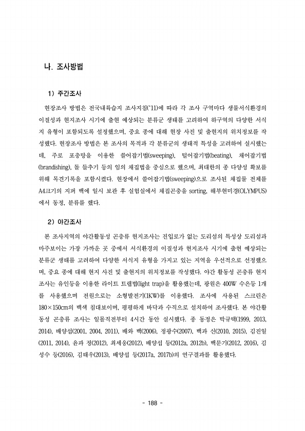 188 현장조사 방법은 전국내륙습지 조사지침 에 따라 각 조사 구역마다 생물서식환경의 `11 이질성과 현지조사 시기에 출현 예상되는 분류군 생태를 고려하여 하구역의 다양한 서식 지 유형이 포함되도록 설정했으며 중요 종에 대해 현장 사진 및 출현지의 위치정보를 작 , 성했다 현장조사 방법은 본 조사의 목적과 각 분류군의 생태적 특성을 고려하여 실시했는 데 주로 포충망을 이용한 쓸어잡기법 , sweeping , 털어잡기법 채어잡기법 beating , brandishing , 돌 들추기 등의 임의 채집법을 중심으로 했으며 최대한의 종 다양성 확보를 , 위해 목견기록을 포함시켰다 현장에서 쓸어잡기법 으로 조사된 채집물 전체를 sweeping A4크기의 지퍼 백에 일시 보관 후 실험실에서 채집곤충을 해부현미경 sor...