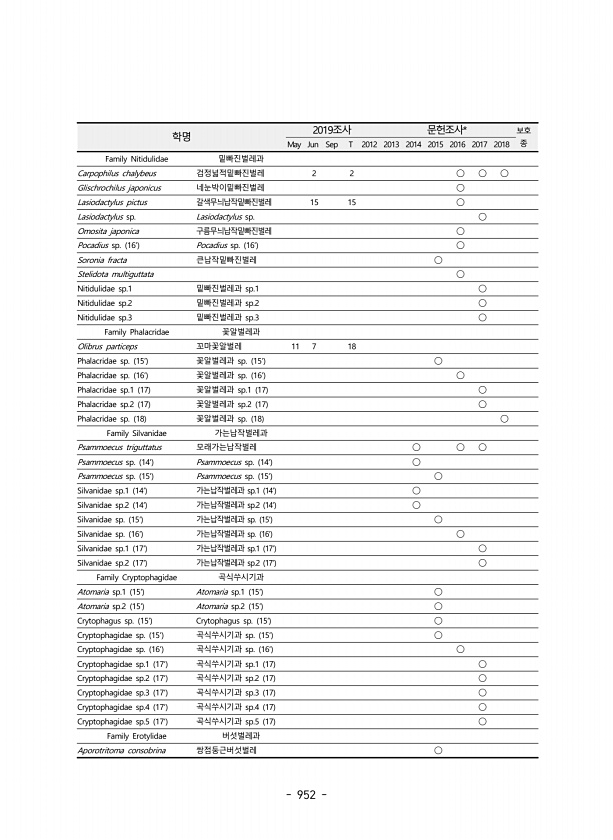 952 학명 2019조사 문헌조사* 보호 May Jun Sep T 2012 2013 2014 2015 2016 2017 2018 종 Family Nitidulidae 밑빠진벌레과 Carpophilus chalybeus 검정넓적밑빠진벌레 2 2 ? ? ? Glischrochilus japonicus 네눈박이밑빠진벌레 ? Lasiodactylus pictus 갈색무늬납작밑빠진벌레 15 15 ? Lasiodactylus sp. Lasiodactylus sp. ? Omosita japonica 구름무늬납작밑빠진벌레 ? Pocadius sp. 16‘ Pocadius sp. 16‘ ? Soronia fracta 큰납작밑빠진벌레 ? Stelidota multiguttata ? Nitidulidae sp.1 밑빠진벌레과 ...