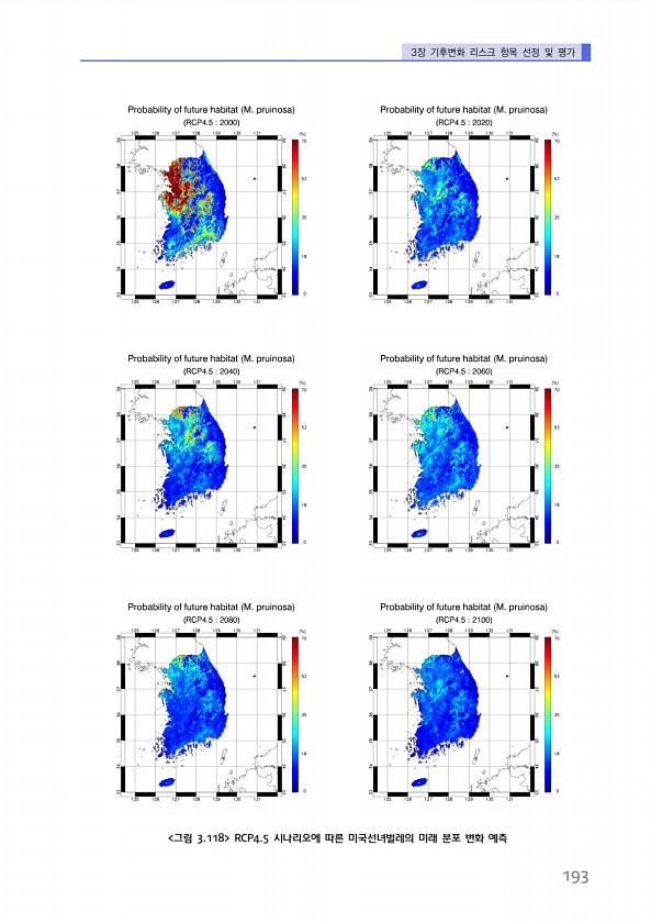 3장 기후변화 리스크 항목 선정 및 평가 193 그림 3.118 RCP4.5 시나리오에 따른 미국선녀벌레의 미래 분포 변화예측
