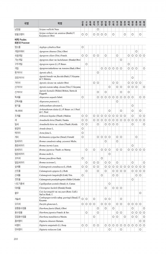 210 남양골 Scirpus wallichii Nees ○ 방울고랭이 Scirpus wichurai var. asiaticus Beetle T. Koyama ex Ohwi ○ ○ ○ ○ ○ ○ ○ ○ ○ ○ 벼목 Poales 화본과 Poaceae 염소풀 Aegilops cylindrica Host ○ 개밀아재비 Agropyron chinense Trin. Ohwi ○ 속털개밀 Agropyron ciliare Trin. Franch. ○ ○ ○ ○ ○ ○ ○ ○ ○ ○ ○ 가는개밀 Agropyron ciliare var. hackelianum Honda Ohwi ○ 구주개밀 Agropyron repens L. P. Beauv. ○ ○ 개밀 Agropyron tsukushiense var. transiens H...