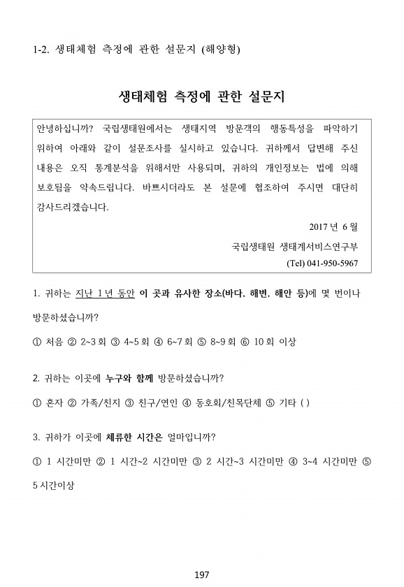 197 1-2. 생태체험 측정에 관한 설문지 해양형 생태체험 측정에 관한 설문지 안녕하십니까? 국립생태원에서는 생태지역 방문객의 행동특성을 파악하기 위하여 아래와 같이 설문조사를 실시하고 있습니다. 귀하께서 답변해 주신 내용은 오직 통계분석을 위해서만 사용되며, 귀하의 개인정보는 법에 의해 보호됨을 약속드립니다. 바쁘시더라도 본 설문에 협조하여 주시면 대단히 감사드리겠습니다. 2017 년 6 월 국립생태원 생태계서비스연구부 Tel 041-950-5967 1. 귀하는 지난 1 년 동안 이 곳과 유사한 장소 바다, 해변, 해안 등 에 몇 번이나 방문하셨습니까? ① 처음 ② 23 회 ③ 45 회 ④ 67 회 ⑤ 89 회 ⑥ 10 회 이상 2. 귀하는 이곳에 누구와 함께 방문하셨습니까? ① 혼자 ② 가족/친지 ③ ...