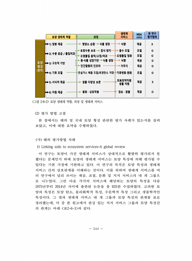 544 그림 2-6-2 토양 생태계 역할, 과정 및 생태계 서비스 2 평가 방법 고찰 본 절에서는 해외 및 국내 토양 형성 관련한 평가 사례가 있는지를 살펴 보았고, 이에 대한 요약을 수행하였다. 가 해외 평가방법 사례 1 Linking soils to ecosystem services?A global review 이 연구는 토양이 가진 생태계 서비스가 상대적으로 활발히 평가되지 못 했다는 문제인식 하에 토양의 생태계 서비스는 토양 특성에 의해 평가될 수 있다는 기본 가정에 기반하고 있다. 이 연구의 목적은 토양 특성과 생태계 서비스 간의 상호관계를 이해하는 것이다. 이를 위하여 생태계 서비스를 여 러 연구에서 널리 쓰이는 제공, 조절, 문화 및 지지 서비스의 네 개 그룹으 로 나누었다. 그런 다음 각각의 ...