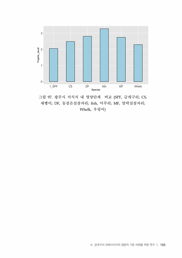그림 광주시 서식지 내 영양단계 비교 금개구리 새뱅이 등검은실잠자리 미꾸리 알락실잠자리 우렁이 Ⅳ. 금개구리 대체서식지의 정량적 기준 마련을 위한 연구 |193