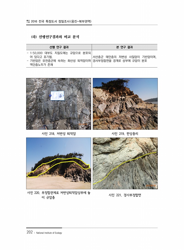 2016 전국 특정도서 정밀조사 옹진-북부권역 202 ? National Institute of Ecology 라 선행연구결과와 비교 분석 선행 연구 결과 본 연구 결과 150,000 대부도 지질도에는 규암으로 분포되 어 있다고 표기됨. 기반암은 유천층군에 속하는 화산성 퇴적암이며 역단층노두가 존재 서산층군 태안층의 저변성 사질암이 기반암이며, 경사부정합면을 경계로 상부에 규암이 분포 사진 218. 저변성 퇴적암 사진 219. 판상층리 사진 220. 부정합관계로 저변성퇴적암상부에 놓 이 규암층 사진 221.경사부정합면
