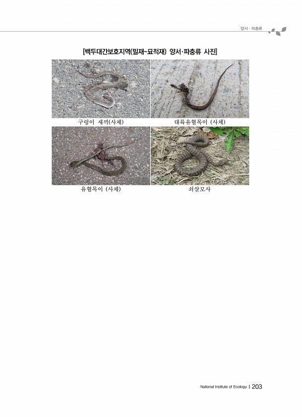 양서ㆍ파충류 National Institute of EcologyⅠ203 [백두대간보호지역 밀재묘적재 양서·파충류 사진] 구렁이 새끼 사체 대륙유혈목이 사체 유혈목이 사체쇠살모사