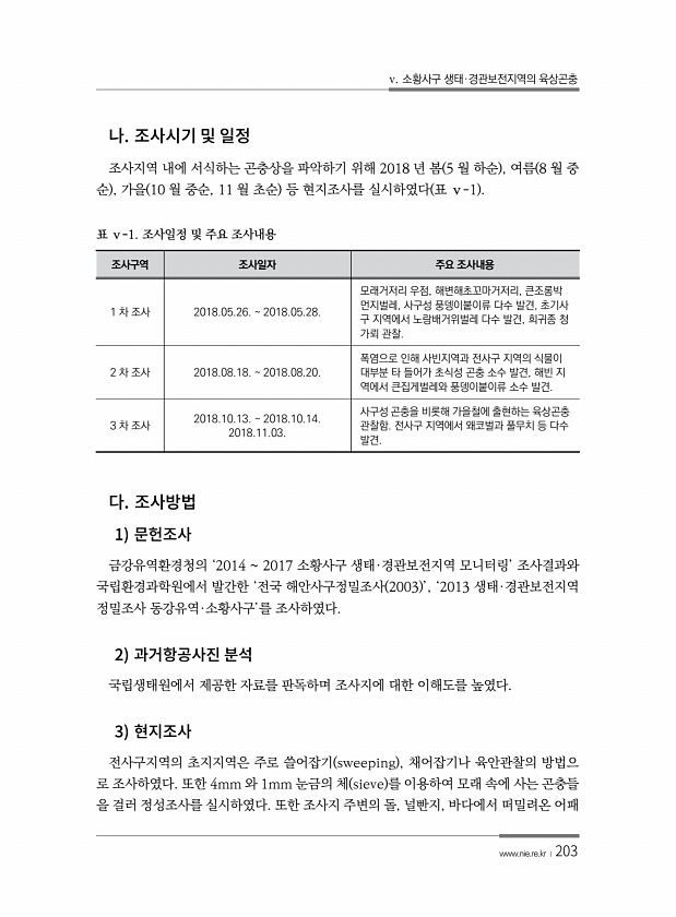 v. 소황사구 생태·경관보전지역의 육상곤충 www.nie.re.kr ?203 조사지역 내에 서식하는 곤충상을 파악하기 위해 2018 년 봄 5 월 하순 , 여름 8 월 중 순 , 가을 10 월 중순, 11 월 초순 등 현지조사를 실시하였다 표 ⅴ-1 조사구역 조사일자 주요 조사내용 1 차 조사 2018.05.26. 2018.05.28. 모래거저리 우점, 해변해초꼬마거저리, 큰조롱박 먼지벌레, 사구성 풍뎅이붙이류 다수 발견, 초기사 구 지역에서 노랑배거위벌레 다수 발견, 희귀종 청 가뢰 관찰. 2 차 조사 2018.08.18. 2018.08.20. 폭염으로 인해 사빈지역과 전사구 지역의 식물이 대부분 타 들어가 초식성 곤충 소수 발견, 해빈 지 역에서 큰집게벌레와 풍뎅이붙이류 소수 발견. 3 차 조사 2018...