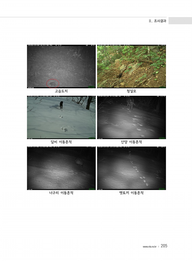 Ⅱ. 조사결과 www.nie.re.kr ? 205 고슴도치 청설모 담비 이동흔적 산양 이동흔적 너구리 이동흔적 멧토끼이동흔적