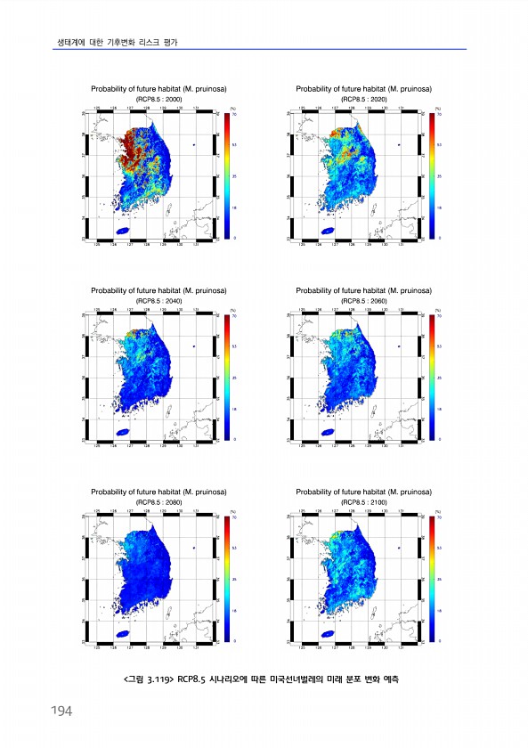 생태계에 대한 기후변화 리스크 평가 194 그림 3.119 RCP8.5 시나리오에 따른 미국선녀벌레의 미래 분포 변화예측