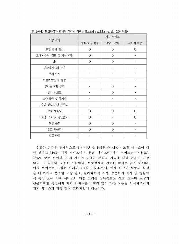 545 토양 속성 지지 서비스 풍화-토양 형성 영양소 순환 서식지 제공 토양 유기 탄소 O O O 모래·미사·점토 및 거친 파편 O O pH O O 기반암까지의 깊이 부피 밀도 이용가능한 물 용량 양이온 교환 능력 O 전기 전도도 O 토양 공극 및 통기성 수리 전도도 및 침투도 토양 생물상 O O O 토양 구조 및 입단분포 O O 토양 온도 O O 점토 광물학 O O 심토 반층 표 2-6-1 토양특성과 관계된 생태계 서비스 Kabindra Adhikari et al., 2016 변형 수집한 논문을 통계적으로 정리하면 총 945편 중 41%가 조절 서비스에 대 한 것이고 34%는 제공 서비스이며, 문화 서비스와 지지 서비스는 각각 8%, 13%로 낮은 편이다. 지지 서비스 중에는 서식처 기능에 대한 논문이 가...
