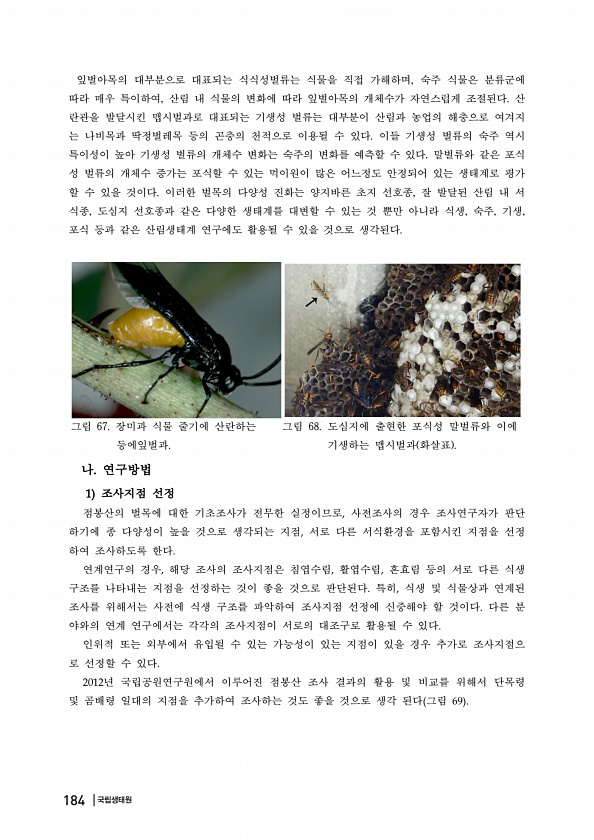 잎벌아목의 대부분으로 대표되는 식식성벌류는 식물을 직접 가해하며, 숙주 식물은 분류군에 따라 매우 특이하여, 산림 내 식물의 변화에 따라 잎벌아목의 개체수가 자연스럽게 조절된다. 산 란관을 발달시킨 맵시벌과로 대표되는 기생성 벌류는 대부분이 산림과 농업의 해충으로 여겨지 는 나비목과 딱정벌레목 등의 곤충의 천적으로 이용될 수 있다. 이들 기생성 벌류의 숙주 역시 특이성이 높아 기생성 벌류의 개체수 변화는 숙주의 변화를 예측할 수 있다. 말벌류와 같은 포식 성 벌류의 개체수 증가는 포식할 수 있는 먹이원이 많은 어느정도 안정되어 있는 생태계로 평가 할 수 있을 것이다. 이러한 벌목의 다양성 진화는 양지바른 초지 선호종, 잘 발달된 산림 내 서 식종, 도심지 선호종과 같은 다양한 생태계를 대변할 수 있는 것 뿐...