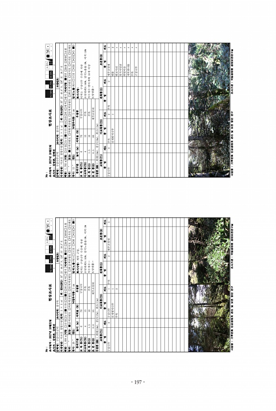 No 조사일자 2017년 10월21일 조사자 김명준, 강혜진 현장조사표 군락명구상나무군락 조사지역장구목 도엽번호식생상관아고산 침엽수림 면적5 × 5 ㎡ 위·경도 GPS 33°21′ 44.0″ N, 126°31′ 18.3″ E 해발1,699 m 지형□산정□능선■사면 □상■중□하 □계곡□평지 미세지형■평면 □돌출 □함몰□요철 방위° 토양■갈색삼림토 □적황색삼림토 □암적색삼림토 □회갈색삼림토 □침식토 □미숙토 □암쇄토 경사20 ° 경도낙엽부식층5 cm 암석노출 % □≥51 □ 50 □ 25□ 5 ■0 층위구분 높이 m 식피율 % 우점종 특기사항계곡 근접, 이끼는 구상나무 수간에 자람 조릿대피도95%, 암석노출율0%, 이끼5% 치수개수- 토양샘플- 교 목 층 T1 6 70 구상나무 아교목층 T2 4 15 주목 관 ...
