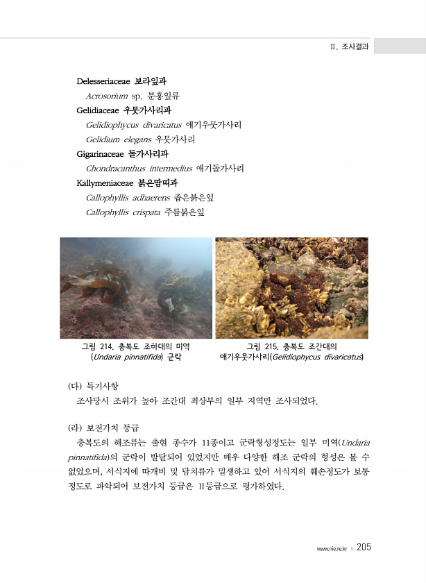 Ⅱ. 조사결과 www.nie.re.kr ? 205 Delesseriaceae 보라잎과 Acrosorium sp. 분홍잎류 Gelidiaceae 우뭇가사리과 Gelidiophycus divaricatus 애기우뭇가사리 Gelidium elegans 우뭇가사리 Gigarinaceae 돌가사리과 Chondracanthus intermedius 애기돌가사리 Kallymeniaceae 붉은땀띠과 Callophyllis adhaerens 좁은붉은잎 Callophyllis crispata 주름붉은잎 그림 214. 충복도 조하대의 미역 Undaria pinnatifida 군락 그림 215. 충복도 조간대의 애기우뭇가사리 Gelidiophycus divaricatus 다 특기사항 조사당시 조위가 높아 조간대 최상부의 일부 ...